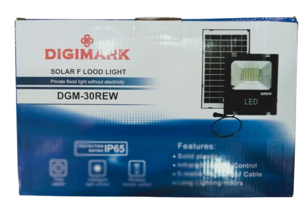 The image shows a Digimark DGM-30REW Solar Flood Light. This is an outdoor LED floodlight designed for private use without requiring external electricity, as it’s powered by a solar panel