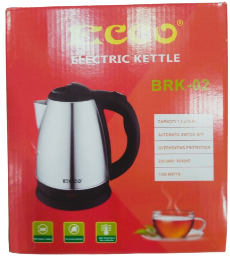 The Ecco BRK-02 Stainless Steel Electric Kettle is a budget-friendly, user-friendly appliance designed for everyday kitchen use. With a 1.8-liter capacity and a 1350W heating element, it offers rapid boiling, making it suitable for families, tea enthusiasts, and busy kitchens