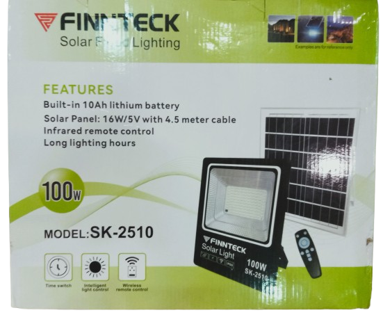 The FINNTECK 100W Solar Lighting (Model: SK-2510) is an affordable and practical solar-powered floodlight designed for outdoor applications such as security, garden lighting, and general illumination. Here’s a detailed overview based on available information: