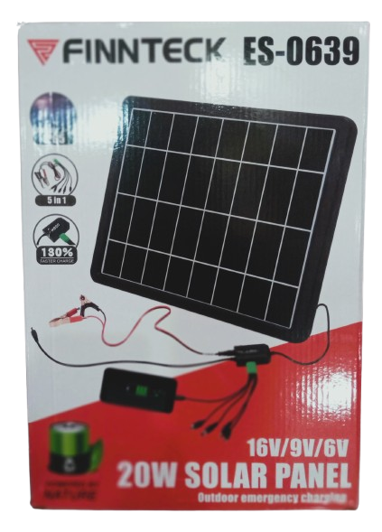he Finnteck ES-0639 is a versatile 20W solar panel designed for outdoor and emergency charging needs. Here’s an overview of its features and specifications