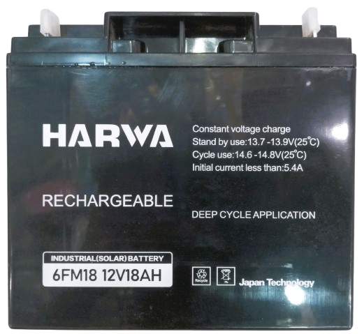 This is a Harwa 6FM18 12V 18AH Rechargeable Deep Cycle Industrial (Solar) Battery, featuring Japan Technology. It is designed for deep cycle applications and is a maintenance-free sealed lead-acid battery