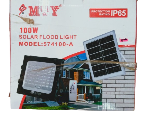 MTY 100W Solar Flood Light, Model: 574100-A, featuring a protection rating of IP65